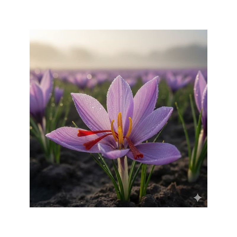 Le Crocus sativus est une fleur automnale d'un mauve délicat, dont l'éclat éphémère de 24 heures révèle le trésor le plus convoité : trois longs stigmates d'un rouge écarlate flamboyant.