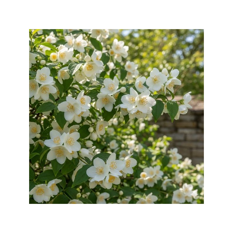 Floraison : C'est son atout majeur. En mai-juin, il se couvre d'une multitude de fleurs simples, d'un blanc crème immaculé. Ces fleurs, regroupées en grappes, dégagent un parfum puissant qui rappelle à la fois le jasmin et la fleur d'oranger. C'est ce parfum qui lui vaut son surnom de "jasmin des poètes".